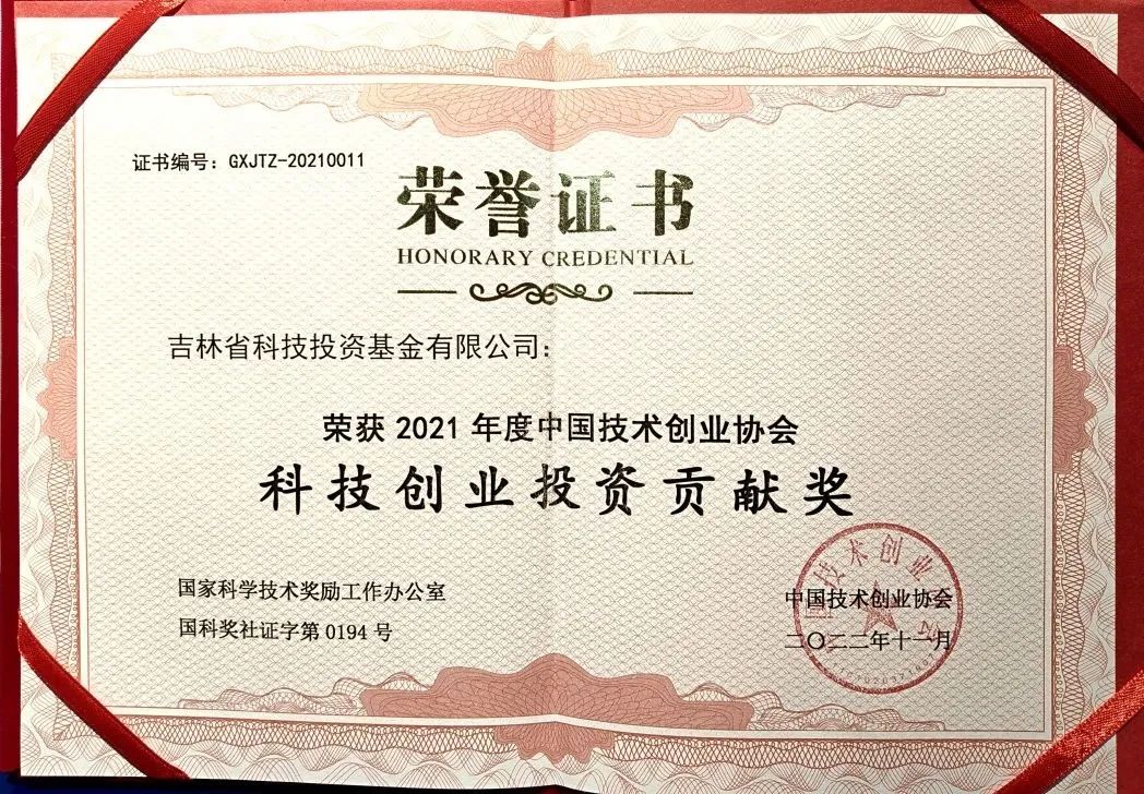 近日,“2021年度中國技術(shù)創(chuàng)業(yè)協(xié)會科技創(chuàng)業(yè)貢獻獎”評審結(jié)果正式公示,吉林省科技投資基金有限公司(以下簡稱“吉林科技投資”或“公司”)成功入圍,榮獲2021年度“科技創(chuàng)業(yè)投資貢獻獎”(全國18家,吉林省2家)。